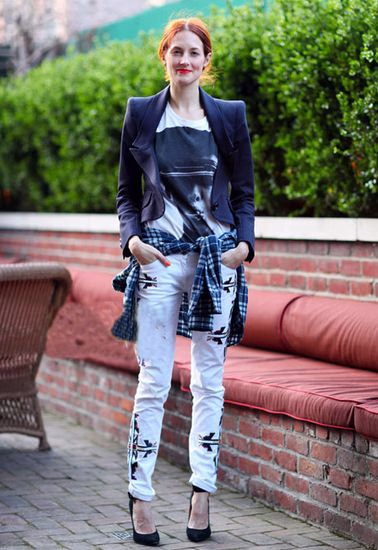 作为内搭,人像T恤也丝毫不会被埋没,夸张的pose是人像T恤不可缺少的。外搭收腰小西装,白色印花铅笔裤,白领也时尚。