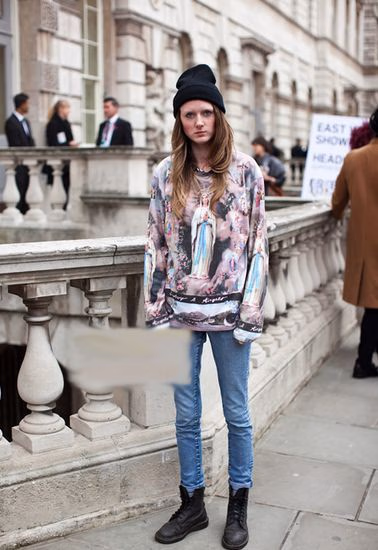 带有宗教色彩的人像T恤,看上去艺术家气息浓厚,随意搭配瘦腿牛仔裤、马丁靴,欧美风就是这么简单易学。