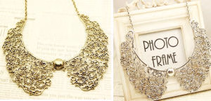 Emporio Armani在 2012春夏秀场上一款透明假领引人注目,线条简单醒目,用黑色蝴蝶结轻盈衔接,多了份俏皮。MaxMara今年春夏系列推出的两款镶有金属亮片的假领,自然率性。 Marni与H&M刚刚火热推出的合作款里也有两款亮片假领,一黑一白两个颜色让人难以取舍,许多顾客干脆两款都收了。