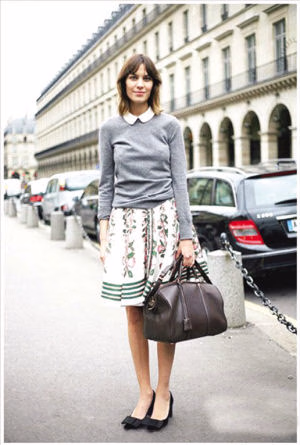 Alexa Chung在 LV的无袖连衣裙外搭配了一件灰色针织衫,露出了连衣裙本身的领子,给我们带来了搭配假领的灵感。有类似假领的,不妨一试。