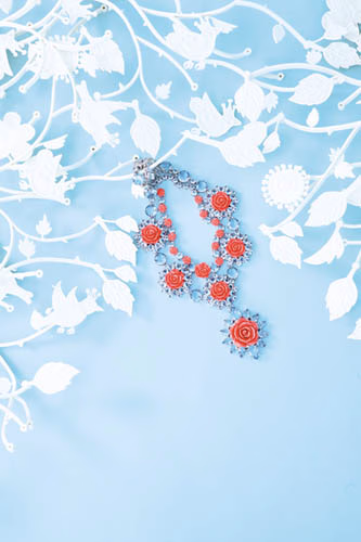 橙红色玫瑰花宝石长颈链连吊坠$17,000、 橙红色玫瑰花宝石颈链$10,500 |