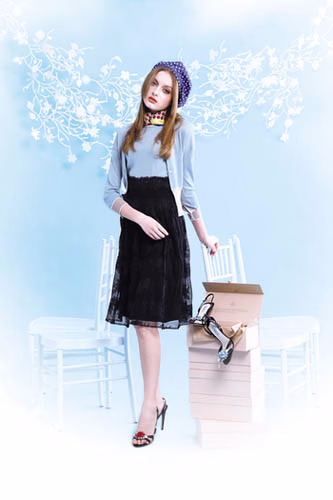 灰蓝色针织背心上衣$3,900 、凉鞋$9,500 、 黑色缀灰蓝色玫瑰花饰高跟凉鞋$9,500 |