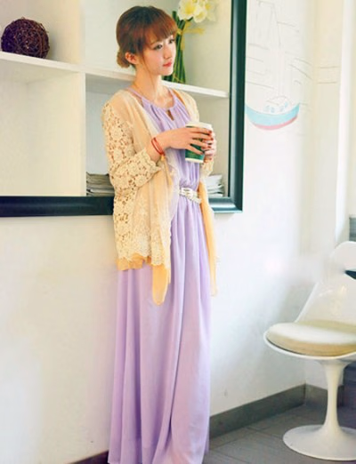 淡雅的晕黄色镂空钩花针织开衫,搭配淡紫色雪纺长裙,特别清新淡雅的色彩,迷人养眼。格外有淑女的味道。搭配白色高跟鞋,气质出挑。