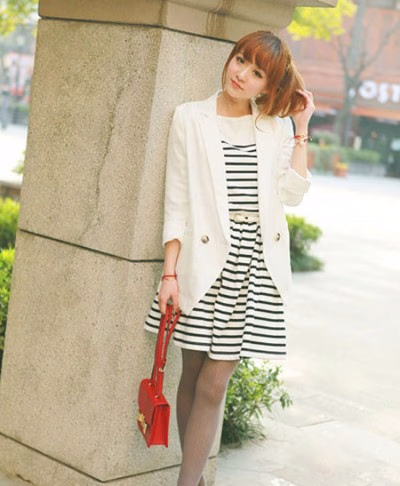 白色修身小西装,精美的裁剪,单粒扣的设计,简约大气,穿在身上很显气质。内搭黑白条纹连衣裙,下穿竖条纹的丝袜,高跟鞋,很显气质。