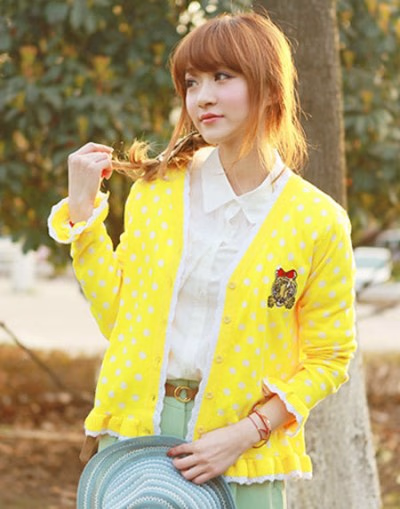 黄色白点针织小开衫,白色花边设计,精美大气。明亮的色彩更显甜美可爱。内搭白色衬衫,下穿浅青色哈伦裤,色彩十分清新。
