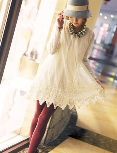 白色蕾丝连衣裙,特别精美的白色蕾丝钩花裙摆,穿在身上格外美丽。金色假领子,今季服装设计的一大亮点,下穿暗红色丝袜,短靴,修身显瘦,尽显千金范儿。
