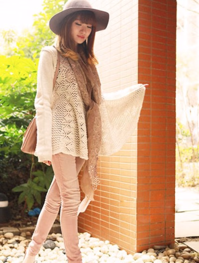 镂空针织开衫,精美的钩花的设计,别致精巧,宽松飘逸的感觉,穿在身上很显气质。内搭长袖T恤,下穿粉色铅笔裤,高跟鞋,高挑身材穿出来啦。