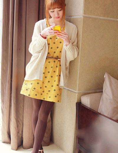 米色针织开衫,蝙蝠袖设计,简约百搭。内搭波点连衣裙配上腰带,更是勾勒纤细的腰带,下穿丝袜,高跟鞋,公主范儿十足。