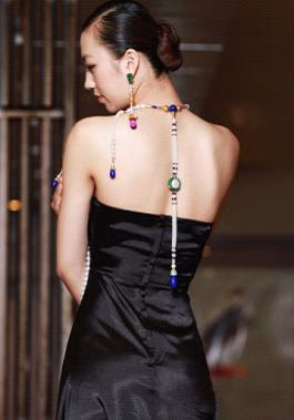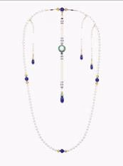 “蕴颐”尊王珍宝系列设计灵感取材自清代贵妃珍宝,结合中国古典文化和现代工艺。其中“念无挂念”是一串极具皇室风范的朝珠,而朝珠的本源为佛家念珠。设计上亦古亦今,长长的项链,以白色风华串起无数意念闪过的时光,巧妙融合清代皇室华贵风范与当今美学。“念无挂念”质地非凡,由395粒白淡水珍珠组成的项链,珠串中均匀嵌入了各色大青金石、金南洋珠、小青金珠及孔雀石、松石等稀有材质,不论是朝珠所示的皇室权力,还是念珠代表的慈心,都是一柄魅力的权杖。