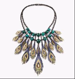 周大福名贵珠宝的“浩瀚无垠”系列的作品则让来宾体验到来自银河的磅礴气势。其中一件作品“万千世界”凤凰孔雀石钻石项链,设计别出心裁寓意非凡,灵感源于浩渺宇宙中的地球,与周围的黯淡相比,它美好绚丽,如同美丽的孔雀。“万千世界”镶嵌5000多颗天然宝石,组成地球色彩和孔雀纹理,呈现大地之黄、海洋之蓝、森林之绿,组成世界万千。