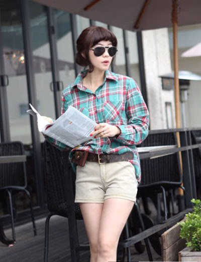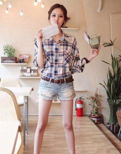 小编点评:格子衬衫又来啦!这次是搭配卷边小短裤,俏丽活泼的姑娘呢!记得要搭配腰带哦,完全展示活力的感觉超好!