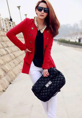 设计很特别的小西装,看起来很帅气,肩膀部分有一点小垫肩,并有收腰处理,下摆剪裁很独特像设计了一些垂坠的小裙摆,不过是帅气的FEEL,前襟是经典的双排扣设计,效果都非常好。
