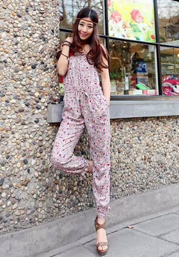 碎花抽绳裤摆连体裤,非固定式样的带扣子的肩带,很凉快,很飘逸,收口绳的小脚裤裤摆的设计,很别致。