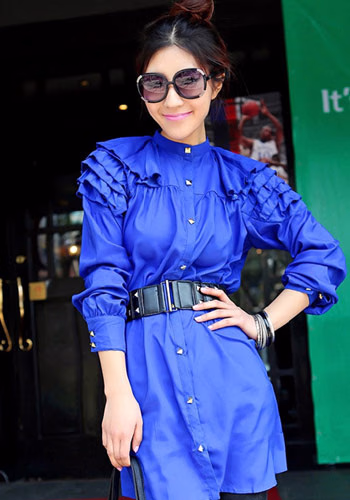 宝蓝色宝塔袖衬衫款裙装,衬衫是小立领的,采用方形的金属扣,五金用的很好,不是廉价的那种五金扣。设计感极佳的层层的宝塔袖设计,让人不自觉的眼前一亮。