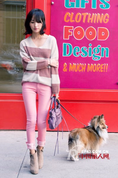 玫红色铅笔裤搭配金属光泽蓝色条纹衫,小西装,在大学里,这样一身LOOK,一定是男生注意的焦点。