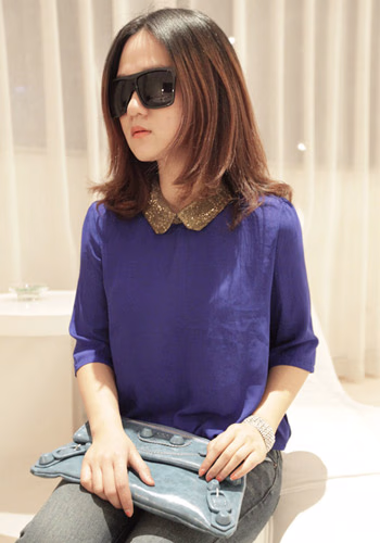 雪纺质地哦 领子是金丝的很欧美,下摆是很大很大的 但是衣服是属于短款 就会非常显得腿长,亮点在领子,半圆领又可爱却不失怀旧。