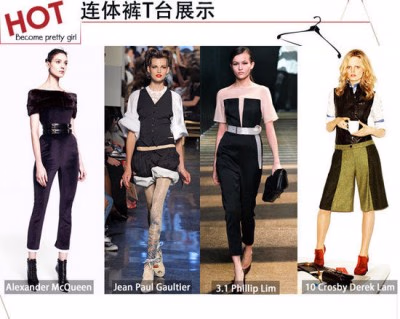 连体裤成为流行趋势并不是没有来由的,来看看各大秀场的T台就知道了。3.1Phillip Lim、Alexander McQueen等众多大牌都在设计中推出了连体裤。其中,Jean Paul Gaultier这件还被李小璐穿上了2012巴黎秋冬时装周,并且大受好评呢。