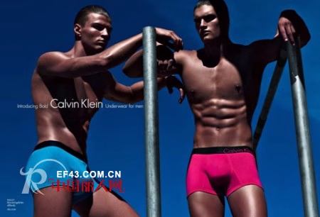 2012春季Calvin Klein Bold新装——为男性设计的全新系列,主打跃动的色彩,图案配以迷彩降落伞、百日花、酸橙水和太阳鱼,在抢眼的黑色腰带上栩栩如生。弹力棉和微纤维织布交织出刚强有力的线条,既有经典款式,如平角裤(boxer brief)和三角裤(hip brief);又有更前卫的款式,包括低腰三角裤或大筒裤。