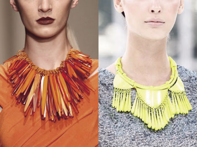 这些极具个性化风格的项饰反射出鲜明的手工质感,并流露出大气的奢华感。如项圈般粗犷的项饰是主要趋势,多以金属、塑料或木头等为材料,强调色彩的浓郁与原始感,而羽毛与皮革显然非常适合打造另类派对风格。