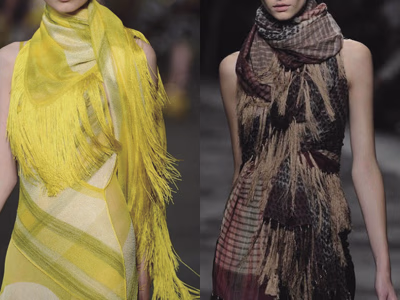 流苏披巾再次回归,成为优雅展现下一季的装饰艺术或手工艺术的重要配饰。值得关注的设计重点包括超长流苏、钩编细节、三角形剪裁等。