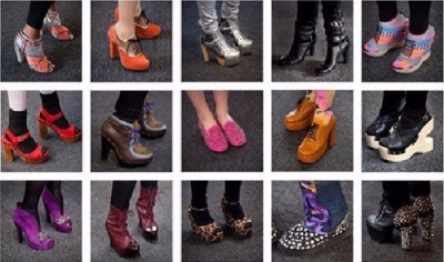 各种各样鲜亮和独特的装饰品出现在鞋子上:纽扣,花边,扣子,吊带,褶皱和浪漫的蝴蝶结。金属和珠子也被大量运用在鞋和鞋跟上。编织元素也被用在了鱼嘴款混搭靴上。