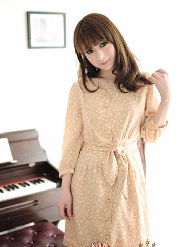 别致的一款杏橘色波点碎花七分袖雪纺连衣裙,清新的色调,简洁的圆领,门襟处的化学装饰扣,腰间的收腰松紧处理,还有系带的设计,穿着非常的修身显瘦呢。