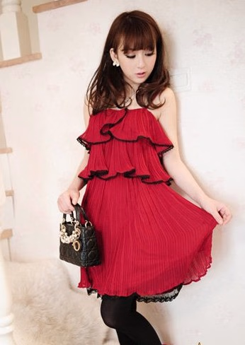 推荐给气质MM穿着的酒红色吊带雪纺连衣裙,细腻的百褶压褶,胸口处的双层荷叶边,采用了黑色蕾丝花边的镶边,与腰间的缎带相呼应。可以单穿去参加party,也可以搭配针织开衫或者小西装,不论上班还是约会穿着都是最美的焦点。