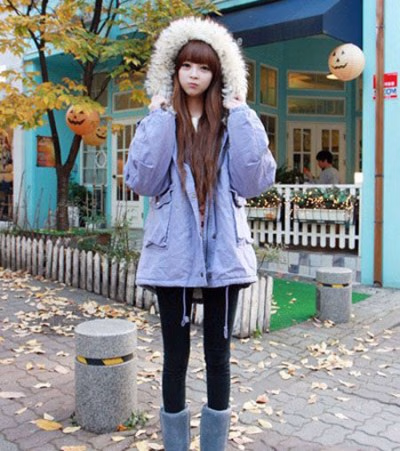 军绿色棉衣外套搭配黑色裤袜,棕色雪地靴,休闲时尚搭配,清新养眼,特别迷人哦。配上齐刘海的发型更是更是甜美动人。