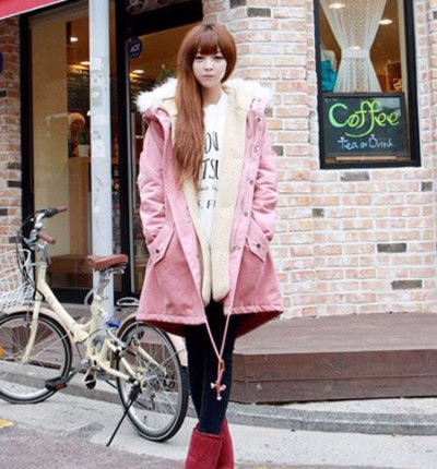 粉色工装风棉衣外套搭配白色卫衣下穿黑色修身长裤,红色雪地靴,粉色是最能体现甜美可爱的气质,也非常减龄,早春不妨这样穿试试?