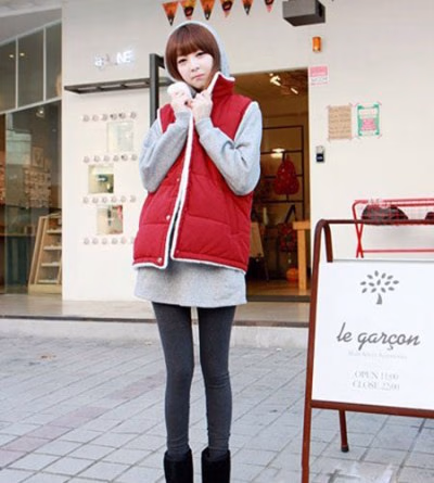 红色羽绒背心搭配灰色卫衣,下穿深灰色打底裤,黑色雪地靴,早春还有点冷,这样穿清新甜美,还保暖减龄呢。鲜亮的色彩尽显青春活力感。