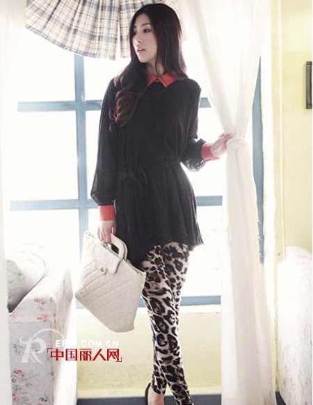 黑色系带宽松长款上衣,很简约大气的色彩清爽便利,红色领口与袖口拼接,经典百搭。下身搭配豹纹打底裤,黑色高跟鞋,很性感哦。