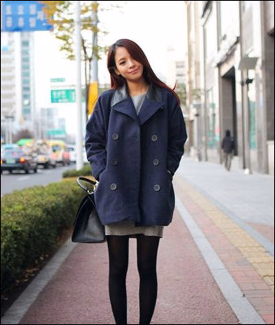 经典双排扣蓝色毛呢外套,宽松的版型松垮有致。特别是双排扣设计,加上深蓝色更有复古的感觉。内色灰色修身连衣裙和裤袜,高跟鞋尽显女人魅力。