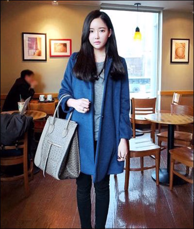 直筒版型蓝色宽松毛呢外套,大大松垮的样子,没有拘束感,特别迷人。尽显复古风范。内搭灰色打底T恤,下穿黑色小脚裤,帆布鞋小清新复古的味道。