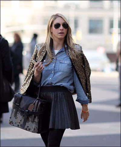 编辑解析:百褶裙与牛仔衬衣的组合最容易打造清纯的学生妹装扮了,但是加上金色亮片外套和豹纹高跟鞋,整个效果就会完全转变,看,时装女王登场了!