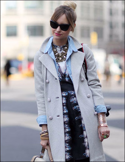 编辑解析:牛仔衬衣绝对不是这套装扮的主角,但是它的功劳可万万不能忽视。抽象的花连衣裙单配外套可能有些生硬,牛仔衬衣的加入在中间起了过渡的作用,看上去柔和不少。