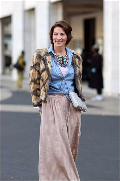 编辑解析:超夸张的阔腿裤搭简单的牛仔衬衣,正好给了阔腿裤足够多的风骚机会,天冷的时候披上皮草外套,Hold冷空气。