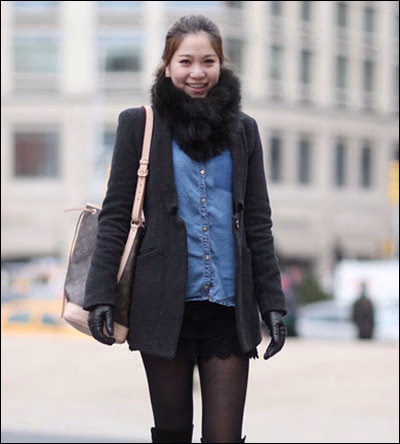 编辑解析:乖乖女也爱的牛仔衬衣,配上西装款式的呢外套,过膝靴和短裤,清秀大方。毛毛围脖给穿着增添了不少时髦感。
