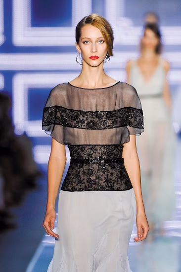 首先还是黑色,让蕾丝真正地成为蕾丝,从来都不能让这色彩缺席;其次是蕾丝的质感,决定其薄透的程度,不一定是所有人都觉得越薄越性感,因此在勾花的运用中,我们能看到古典式的技法(层叠式)能让其颇显质感之余,还不裸露。但最重要的是,这些蕾丝应该怎样运用才会脱离艳俗的行列,其一是用在边角等位置,自动过滤其性感元素,其二是配合服饰原料一起呈现,跟勾花或者针织面料相结合,效果也相当不错。