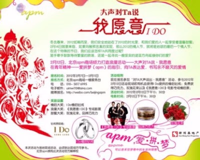 为了能够让更多在生活压力下、精神束缚中渐渐迷失自我的年轻人有一个彻底放松和解脱的舞台,让那些还没有缺失信仰仍在坚持理想的年轻人有一个尽情发挥的舞台。北京apm商场在新青年榜样征集活动取得成功之后,于2012年的情人节期间,全力打造浪漫活动——大声对TA说?我愿意。让更多年轻人在北京apm青年精神——爱拼梦(apm)的指引下,向TA表达爱,书写永不磨灭的爱情。本次活动还会有IDo品牌提供的情侣对戒;免费的巧克力、玫瑰花束以及《我愿意IDo》电影专场情侣票。