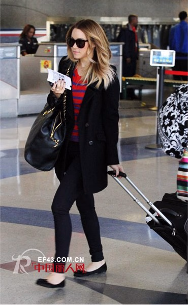时尚解析:小脚裤搭配平底鞋再度回归,搭配条纹衫、中长款西装,在加上黑色大容量包,一样气场十足。