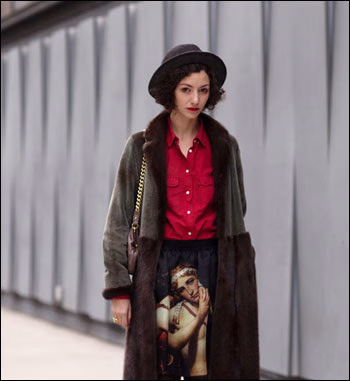 编辑解析:很少能见到将欧洲油画印上半裙的设计,将艺术作品融入服饰,提升了整套服装的品味。外套同等宽度的毛边与短裙融合在了一起,看上去舒服极了。