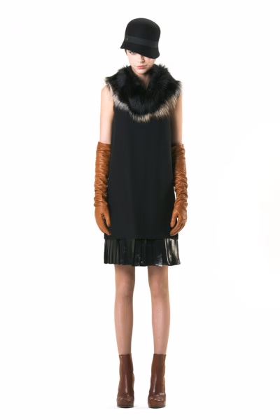 诸多从男装造型中汲取的中性风格灵感融入Sportmax 2012早春女装的设计中。裙装却以腰部的缠裹式设计来凸显身体线条,贴合身体轮廓的皮革裙身,同样带着未来主义的利落感觉。暗色连身裙配上亮橙、荧光黄色的丝绸镶边,或是以奢华的皮草、宝蓝来点亮全身的暗色系搭配,出其不意的亮色运用带来了更强的视觉冲击。