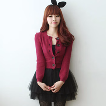 短款的小外套,刚刚好到腰际的长度,轻松突出性感小蛮腰,充满女人味的酒红色,和黑色公主纱裙搭配,简直就是王道,甜美性感两种气质交融在一起,十分出众。