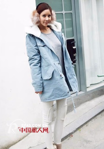 淡蓝色的大衣温馨浪漫,宽松的版型修饰身材缺陷,弧度感觉的连帽设计,内里采用了细腻的羊羔毛面料,保暖美观兼顾。