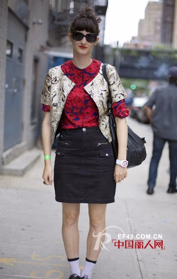 除了青花瓷之外,另一个中国风元素就是刺绣。这里的玫瑰花纹配合浓浓的中国红,如果在妆容上也相互辉映,整个造型的混搭就十分出彩。
