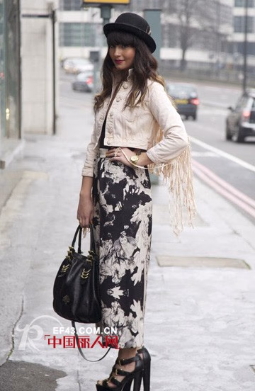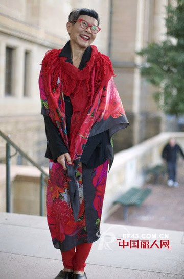 谁说花朵单品是年轻人的专利?看看这位时髦的前辈吧!红与黑的色调玩得炉火纯青,大花流苏披巾可做围在脖子上也可以随意地搭在肩膀上点缀全身装备,配上她的红框眼镜和爽朗笑容,花仙子从没有年龄之分!