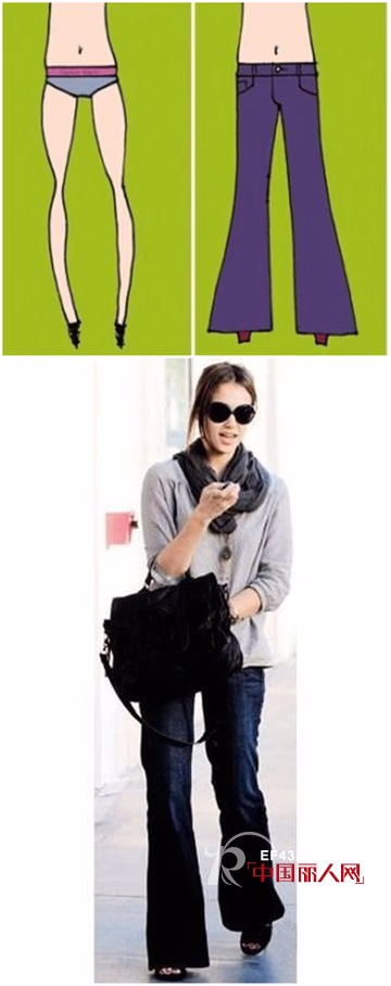 如果你的腿形有点X的话,那就可以选裤管设计成喇叭形的牛仔裤来掩盖腿形上的缺陷。如果你还是1970年代嬉皮风的粉丝的话,那就更应该多入手几条喇叭裤了。