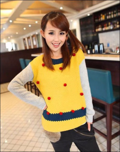鲜艳的糖果色彩的毛衣,鲜艳的色彩,散发出甜美的青春气息,厚实的面料,具有非凡的保暖效果,精美而立体的小毛球点缀,俏皮可爱,搭配军装风格的短靴,呈现甜美的帅气风。