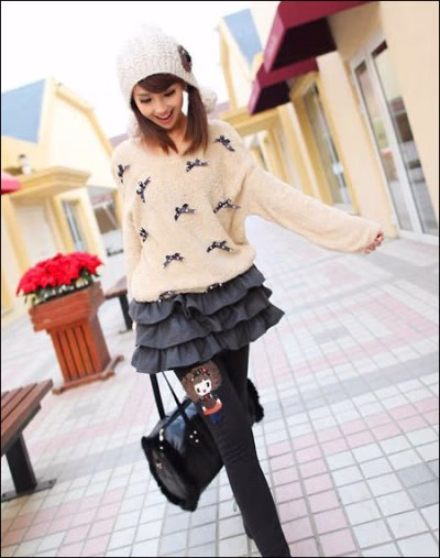 淡淡的卡其色彩的针织衫,细腻而轻柔的面料,穿着起来非常的舒适,衣身上布满小巧的蝴蝶结图案,呈现出非常可爱的俏皮味道,略带宽松的剪裁非常的轻松,呈现出舒适的质感。