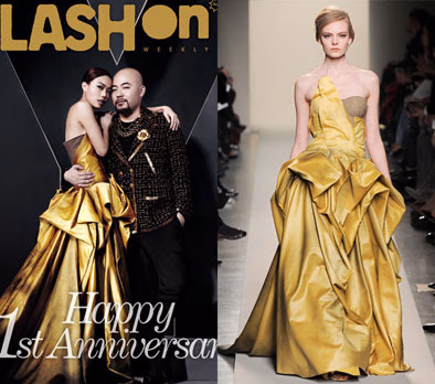 在另一张宣传图片上,我们可以看到容祖儿与黄伟文的合影,容祖儿身着Bottega Veneta 2011秋冬系列礼裙,而黄伟文则穿着Chanel经典的粗呢外套,继续High Fashion的演绎。